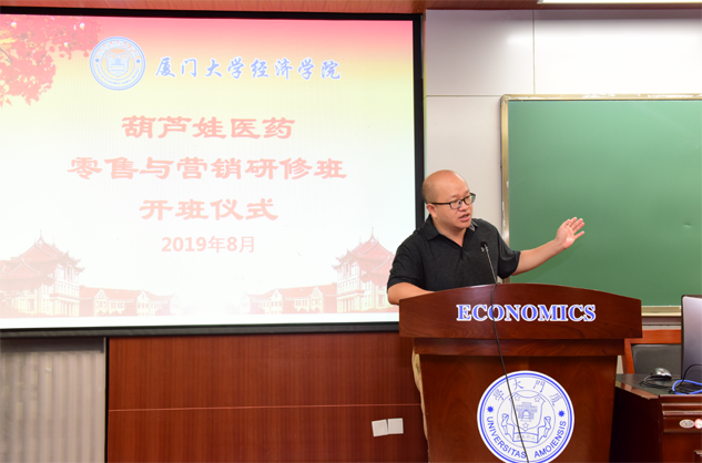 在开班仪式上,廖景峰主任首先代表厦门大学经济学院热烈欢迎富易堂医药零售与营销研修班的学员到厦大学习,并就厦门大学及经济学院的相关情况进行了介绍。他说,富易堂学员走进厦大就是厦大的校友,希望未来的日子能够关心、支持母校的发展,多提宝贵意见,同时他也祝大家在厦大学习期间学有所成、学有所获。