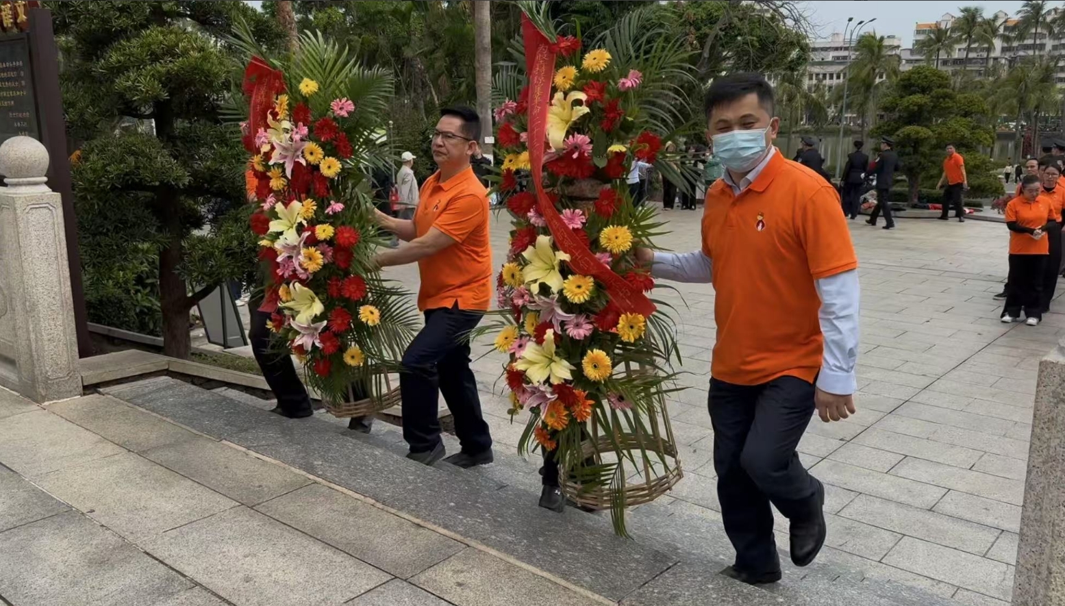 经过一段时间的等待才轮到富易堂。富易堂首先向烈士敬献花篮,花篮缎带上写着“为坚持琼崖革命23年红旗不倒牺牲的烈士们永垂不朽!”“为解放海南岛渡海牺牲的烈士们永垂不朽!”鲜艳的花篮寄托富易堂对革命先辈的崇敬和哀思。